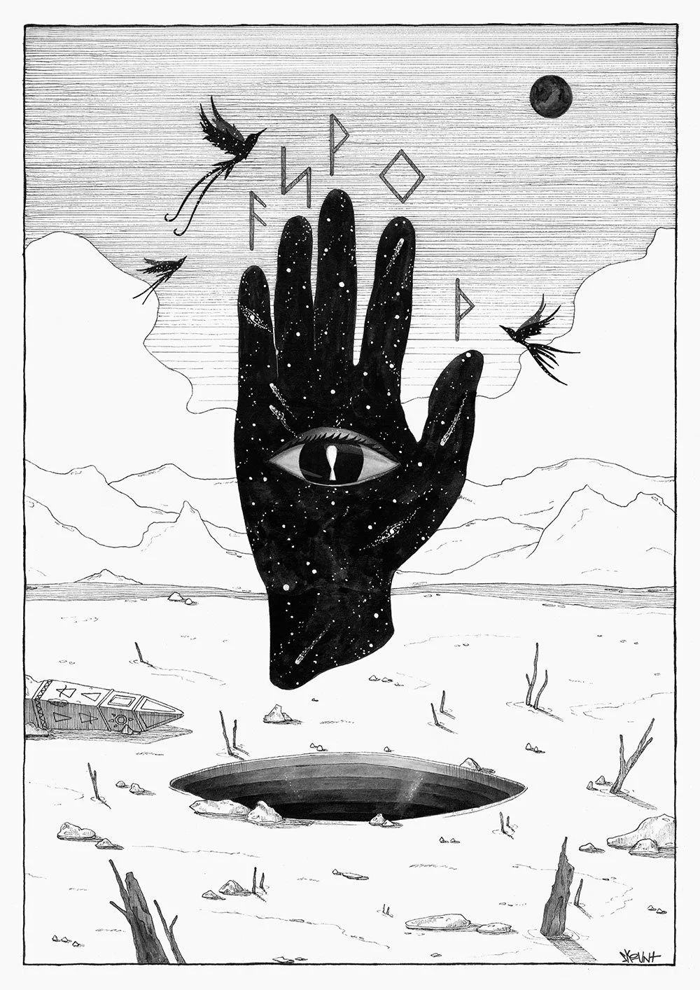 This drawing embodies the potential of inner revelation. The cosmic hand with its central eye symbolizes illumination, awareness, and resilience as it hovers over an abyss. Viking runes deepen its mystical language: