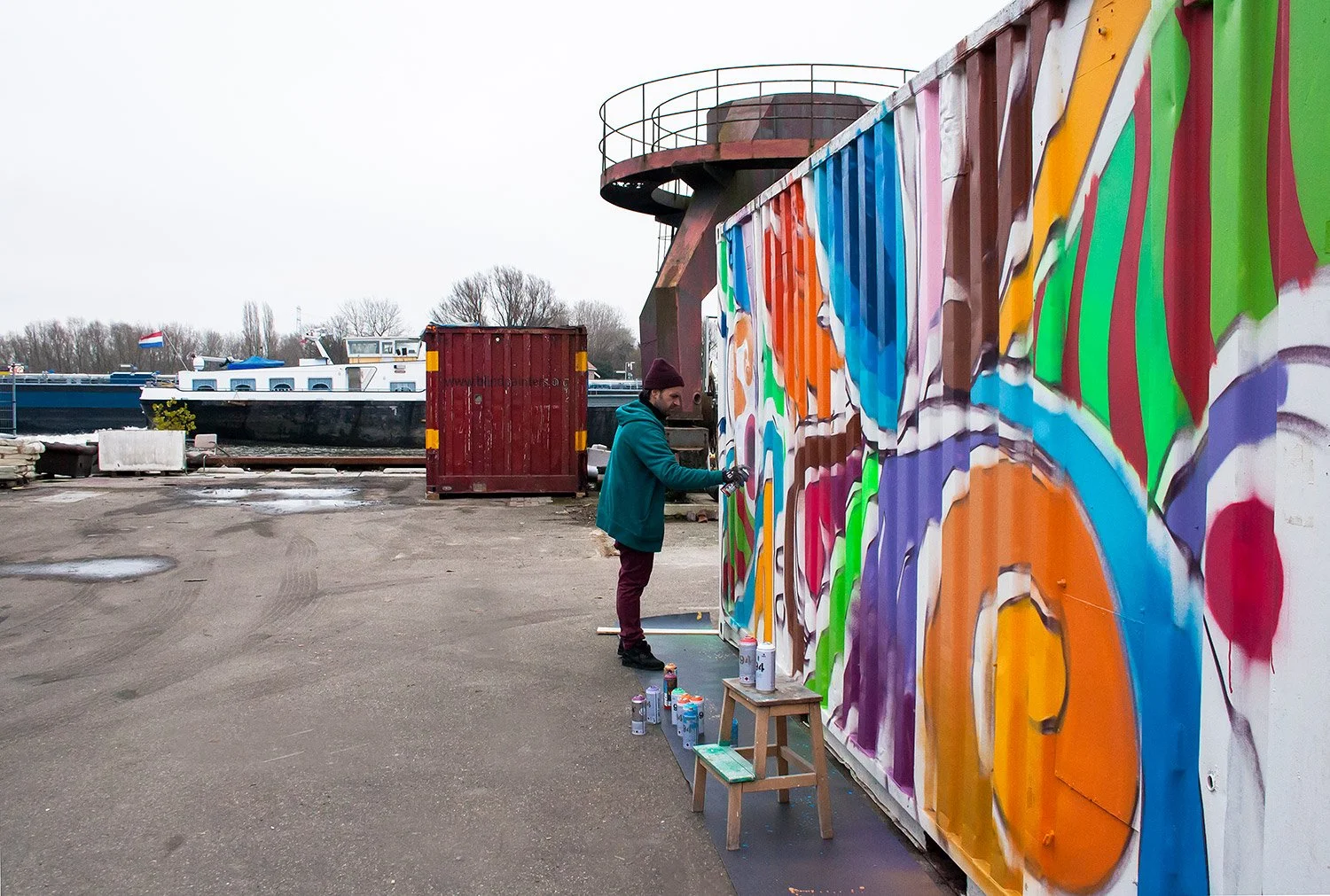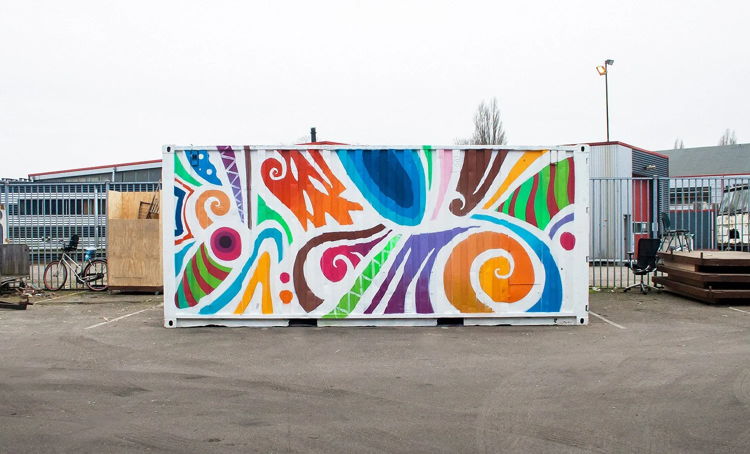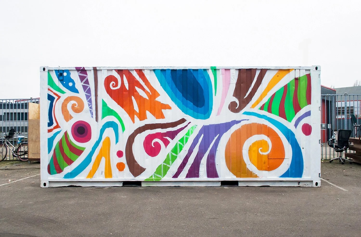 I painted this shipping container as part of a series that i am currently working in, based on the idea of a possible artificial macro ecosystem, mixing organic, geometric and abstract forms inspired by different ecosystems of places I am visiting, including colors, plants, landscapes, people, customs and patterns from the pure nature of the place and how the native people include this on they day life, rituals and culture.